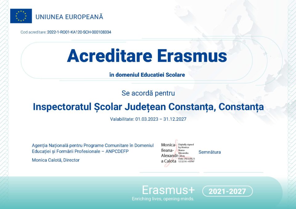 Inspectoratul Școlar Județean Constanța a obținut Acreditarea Erasmus+ nr. 2022-RO01-KA120-SCH-000108334, în baza căruia se vor derula în perioada 2023 – 2027 mobilitățile în domeniul Educație Școlară, așa cum au fost ele enunțate în aplicație și în strategiile instituționale.